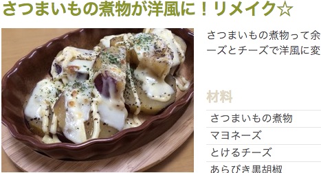 さつまいもの煮物を作ったはいいが、食べきる前に飽きてきた…。そんなときに役立つリメイクレシピ。持て余してしまった和風の煮物に、マヨネーズとチーズを加えれば洋風に大変身!黒こしょうは少し多めに加えて、ピリリと仕上げると美味しいですよ。